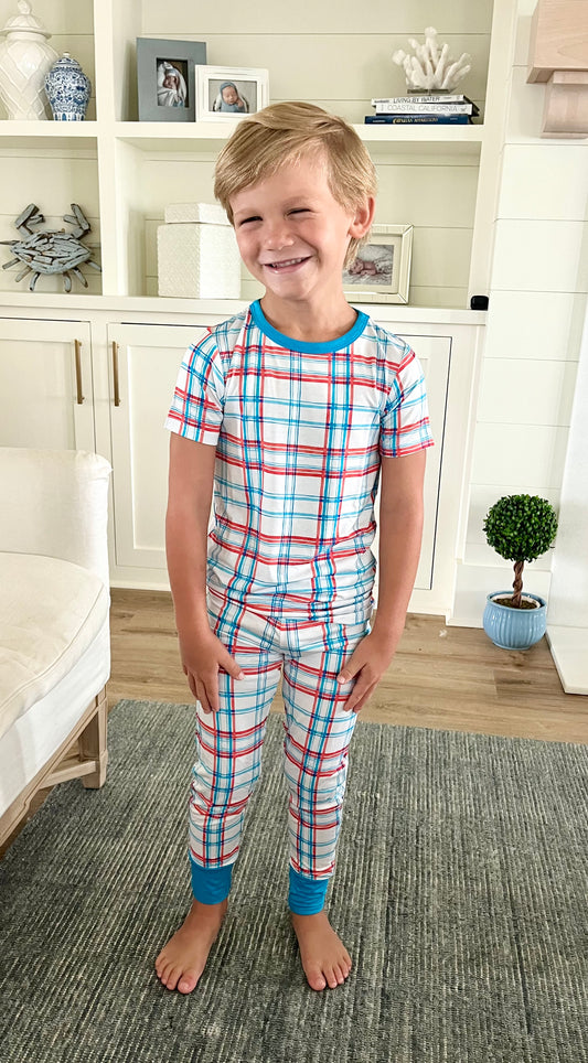 Blue/Red Plaid Two Piece Pajama Pants Set